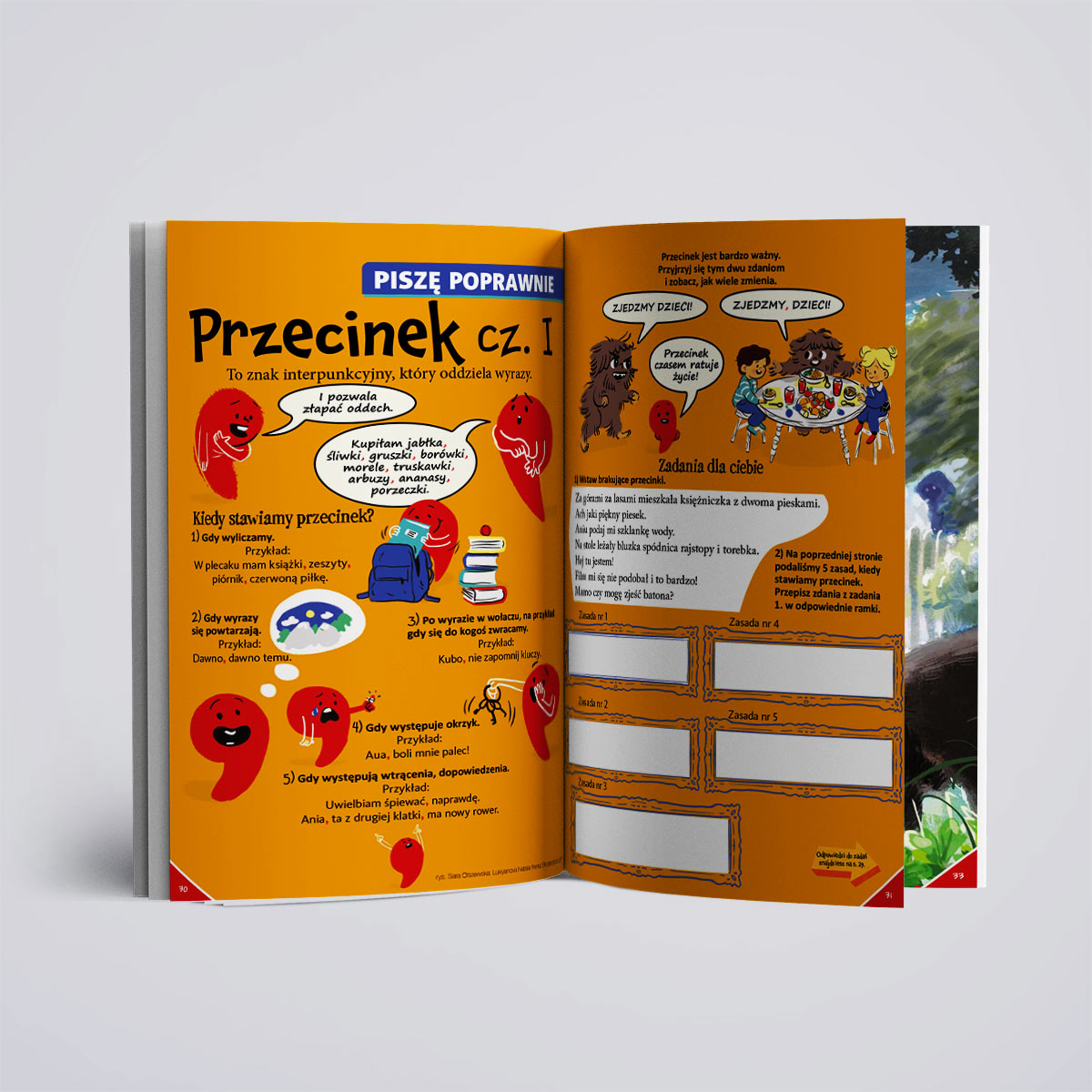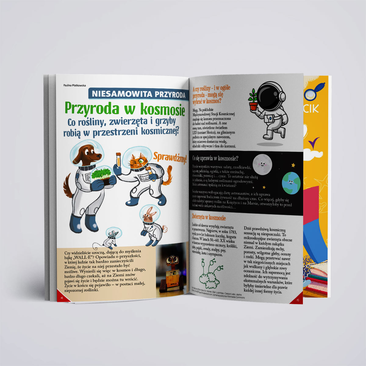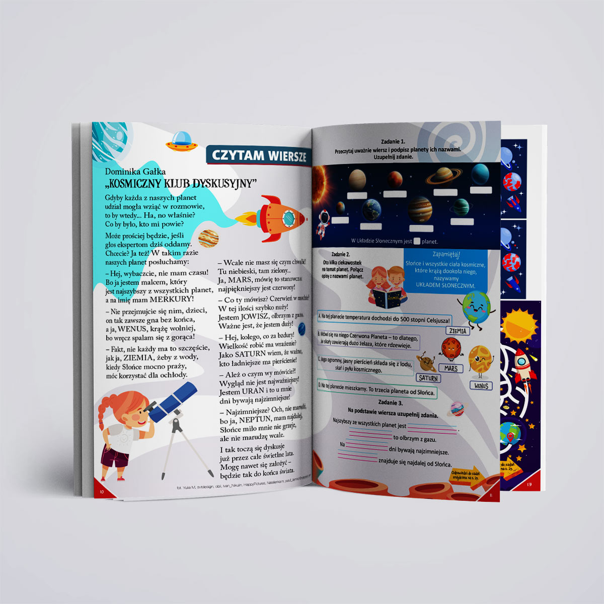 To będzie kosmiczna wyprawa! Sprawdzimy, co rośliny i zwierzęta robią w kosmosie. Wow, tam są nawet grzyby?! Odkryjemy, co znaczą kosmiczne powiedzonka. Podyskutujemy o planetach. A nasze łamigłówki? Wcale nie będą kosmicznie trudne. Sprawdźcie sami! Dobre maniery są z kosmosu? O nie! Jak zachować się przy stole powinien wiedzieć każdy – Kostek już Wam opowie dlaczego. A czy wiecie, że przecinek czasem ratuje życie? Tak, tak, wiele zależy od tego, gdzie go postawicie. Co jeszcze? Odwiedzimy alpaki. A malowanka jest specjalnie dla Was – opowiedzcie o swoich zwierzakach. Sprawdzimy też, co robią płuca. Wdech, wydech i zabieramy się do czytania!